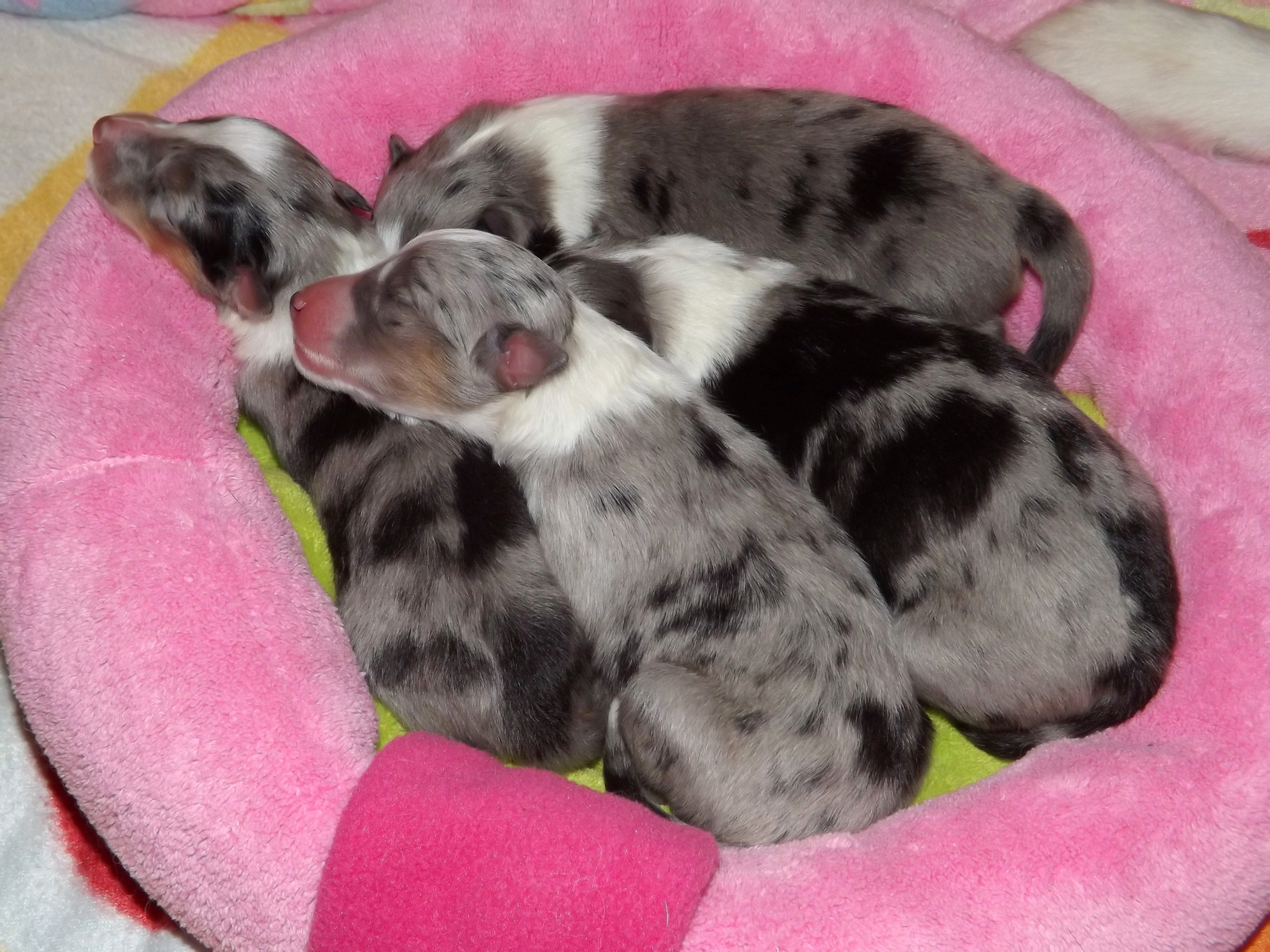 Všem na vědomost se dává, jedna velmi milá zpráva. Jessince a Topíkovi se narodili tři kluci a jedna holčička, všichni ve zbarvení blue-merle s lysinkami a slušivými límečky.